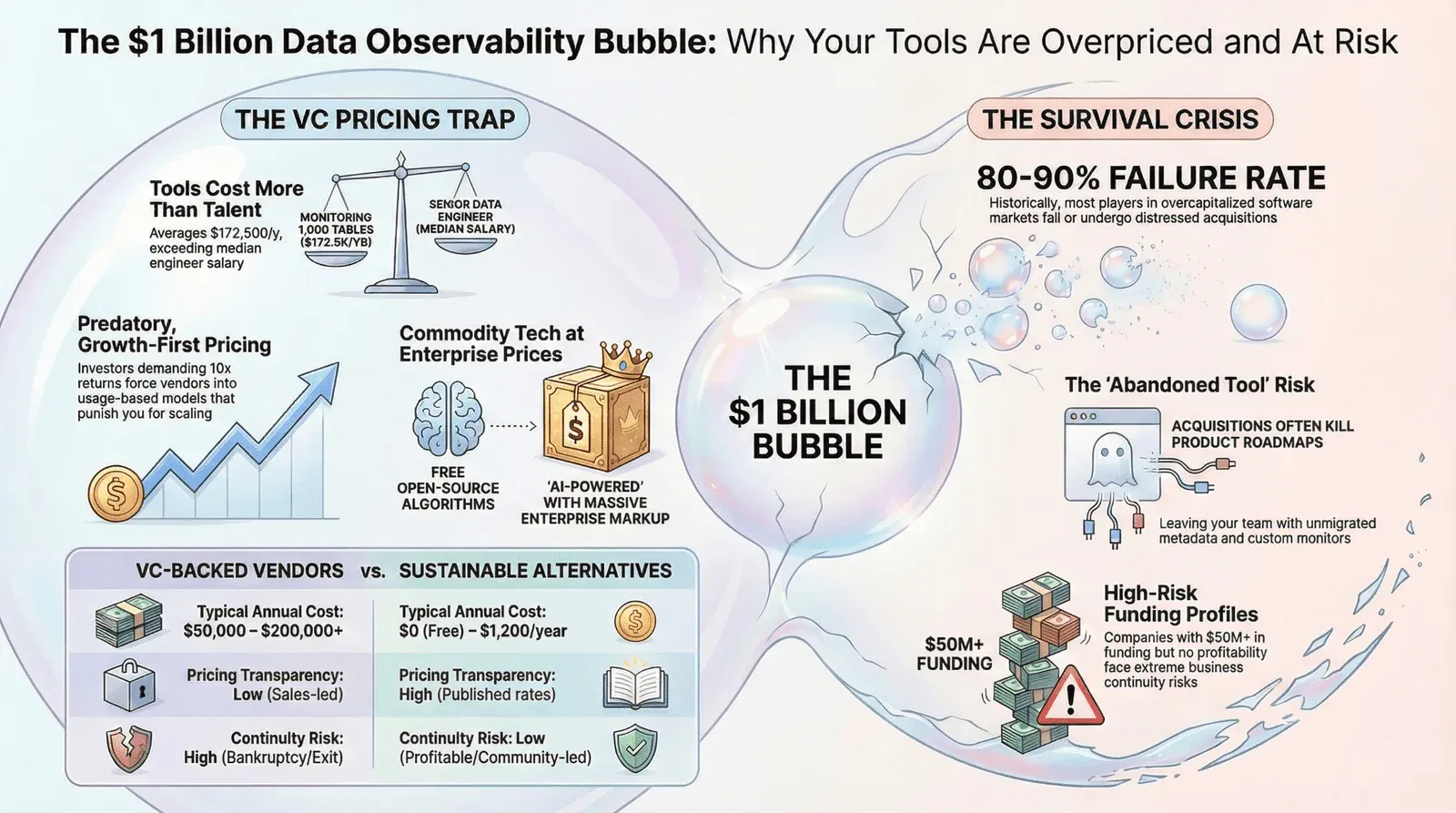This article warns data professionals that the billion-dollar surge of venture capital into the data observability market has created an unstable, overpriced ecosystem. The author argues that high investor expectations force vendors to implement predatory, usage-based pricing that often costs more than hiring a full-time engineer. Because the market is oversaturated, many of these companies face a high risk of bankruptcy or disruptive acquisitions, leaving customers with abandoned tools and lost metadata. Furthermore, the text claims that expensive platforms often charge premium rates for basic open-source algorithms while failing to automate the difficult aspects of business logic. To avoid these financial and operational risks, the authors advocate for transparently priced or open-source alternatives from profitable, independent providers. Ultimately, the narrative serves as a cautionary guide for evaluating the long-term viability and true cost of data quality and data observability software.