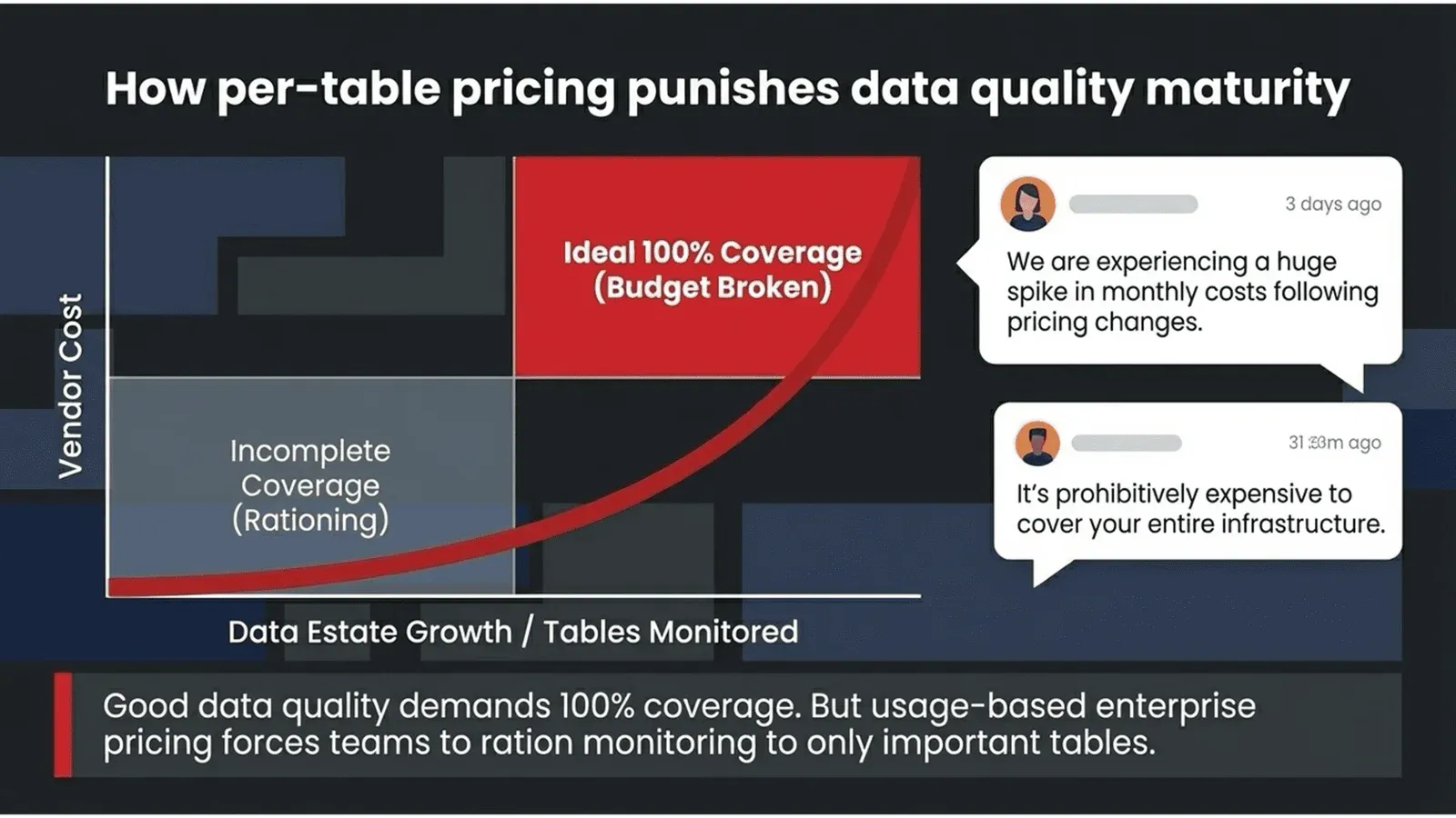 The industry average to monitor 1,000 tables is approximately $172,500 per year, which is more than the median annual salary of a senior data engineer. The cost of the technology does not set that price. It is set by what a venture fund spreadsheet says a company needs to justify its valuation. The practical consequence is that teams stop asking whether to monitor everything and start asking which tables they can afford to leave dark, which is the opposite of what data quality requires.
