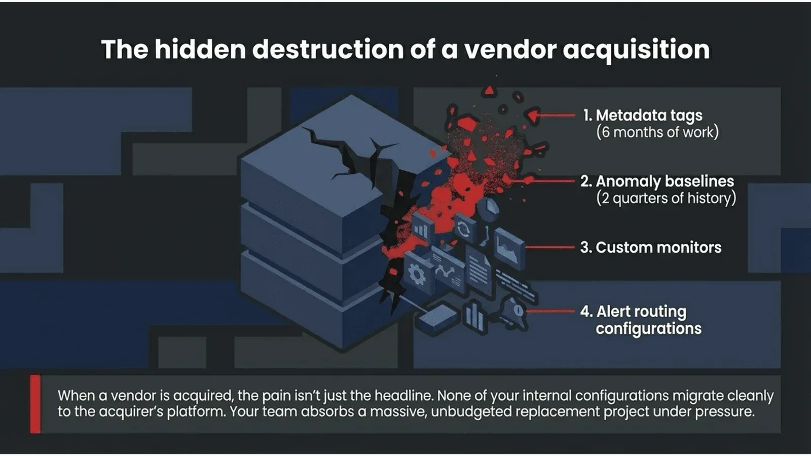 And when an acquisition happens, the pain is not just the headline. It is everything your team built inside that tool. The metadata your engineers tagged over six months. The anomaly baselines took two quarters of ingestion history to become meaningful. The custom monitors are tuned to your specific data. The alert routing for your on-call rotation depends on. None of that migrates cleanly to the acquirer’s platform. In most cases, it does not migrate at all. Your team absorbs a replacement project under pressure, on top of everything else they were already doing. That cost never appears in the original contract. It should.