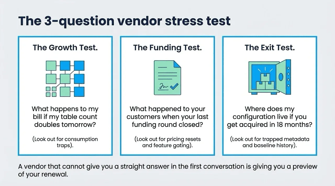 Ask what happens to your bill if you double your table count tomorrow. Ask what happened to their customers’ pricing when the last funding round closed. Ask what your exit path looks like if they are acquired in eighteen months and whether you can export your configuration, test history, and anomaly baselines. A vendor that cannot answer all three clearly in the first conversation is telling you something important about how the relationship will go at renewal.