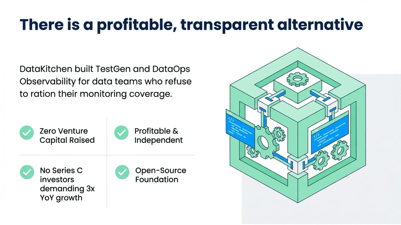 DataKitchen’s answer is TestGen and DataOps Observability, both open-source. We have raised no venture capital. We have been profitable from day 1. We do not have a Series C to justify.