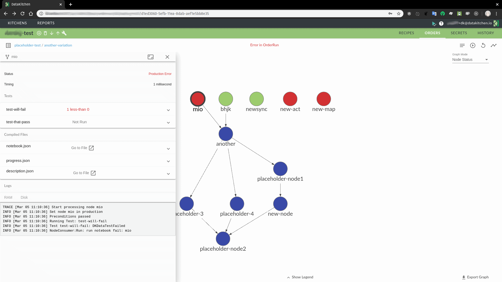 In the below example, the first-level node “mio” is a processing step in the data operations pipeline. Node mio executes and fails one of its tests. Nodes at the same level as mio can execute, but any node dependent on mio has an issue. In this case, the node “another” depends on the output of mio. The orchestration can be configured to take steps to address this failure mode depending on the severity of an error.