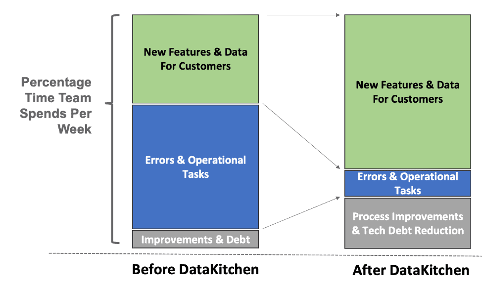 When an enterprise uses the DataKitchen Platform to implement DataOps, they spend far less time on errors and operational tasks. They find they can spend the majority of their time on innovative new features for their internal customers and stakeholders.
