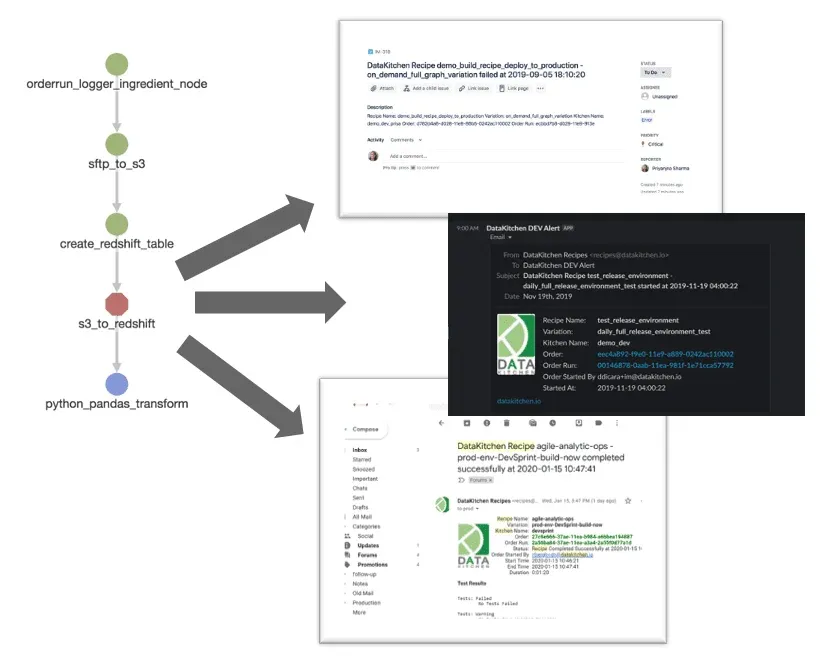 When tests fail or issue warnings, the orchestration engine could be programmed to take action. In many cases, that is an alert or message sent through slack, email or another messaging application. The image below shows how a pipeline error in the “s3_to_redshift” node triggers messaging applications.