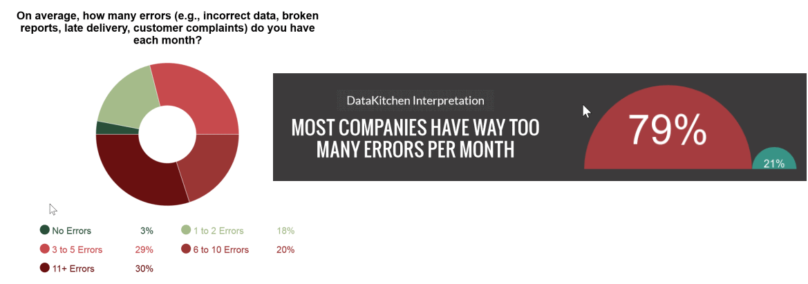 Enterprises that follow DataOps principles typically have less than 1 error per year. That is orders of magnitude better than the industry norm. In a recent DataOps survey, only 3% of the companies surveyed approached that level of quality. Eighty percent of companies surveyed reported three or more errors per month. Thirty percent of respondents reported more than 11 errors per month. This is a staggering figure, and it has implications.