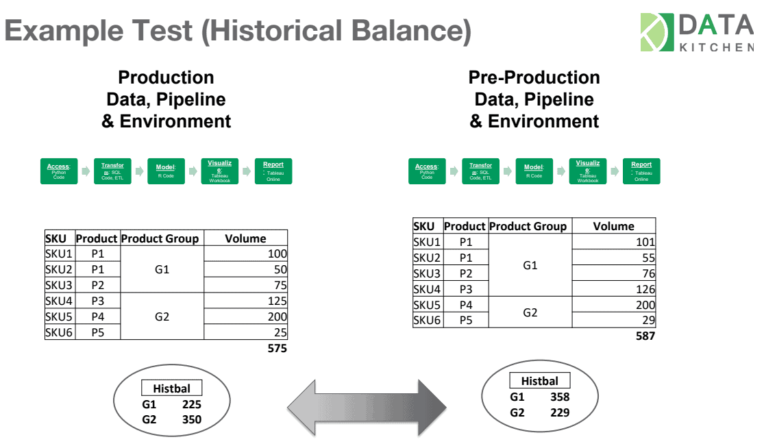 Two common tests are location balance and historical balance tests. The location balance tests check the number of rows, dimension and facts at each stage of the data pipeline. If they don’t match business logic, the orchestration engine optionally stops the data pipeline and issues an alert or warning to the data team.