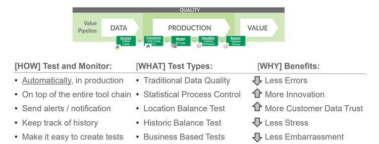 Testing plays a dual role in a DataOps enterprise. The Value Pipeline represents data operations. It takes data and transforms it to create value for the organization. We don’t want data pipeline errors ruining operational analytics. We don’t want to learn about analytics quality issues from users and customers.