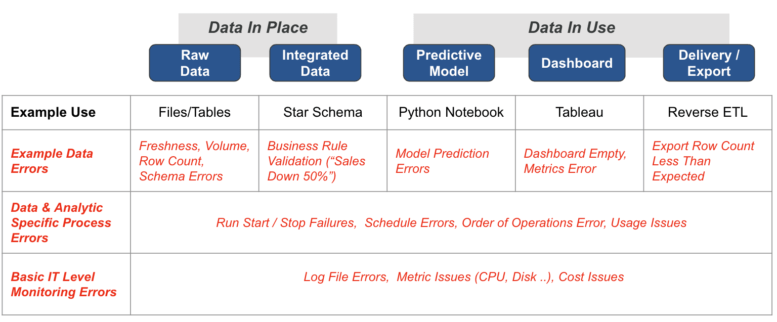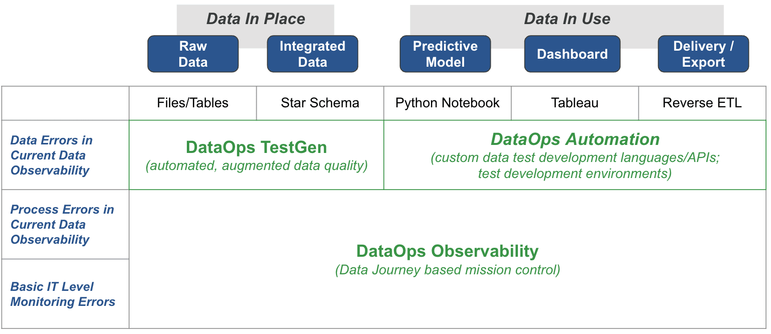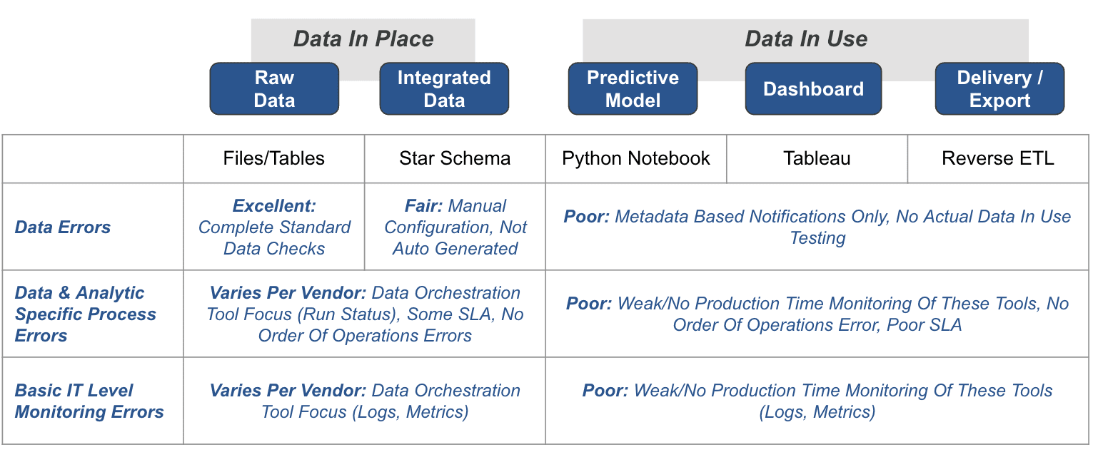 This existing paradigm fails to address the challenges and intricacies of “Data in Use.” For example, these tools may offer metadata-based notifications. Still, they cannot perform actual data-in-use testing, which is crucial for applications like Business Intelligence tools, predictive models, and export/reverse ETL processes. The production-time monitoring of these observability tools often falls short, failing to provide order of operations error checking or SLA compliance checks. This leaves data engineers in the dark regarding ensuring the quality and reliability of data once it has left its storage medium and is actively being used in various applications. The existing tools only solve half the problem, calling for a more comprehensive approach to data observability encompassing Data in Place and Data in Use.
