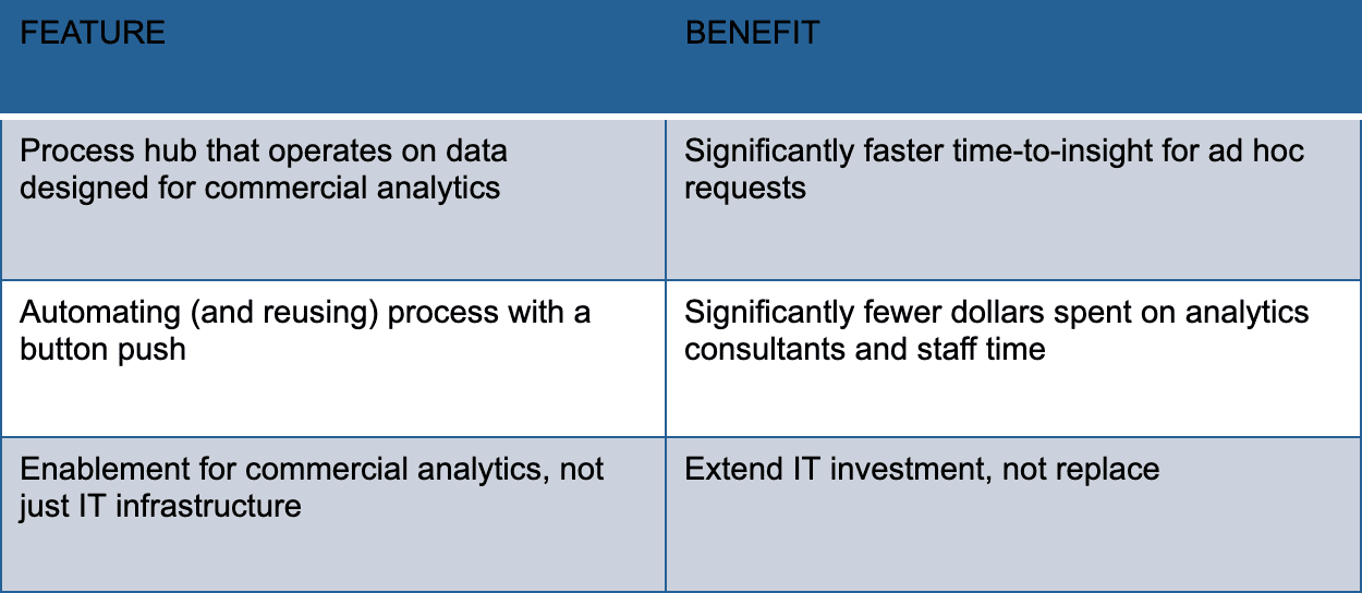 - Repetitive data process and query work reduce the time the commercial pharma analytics team has to create original insight.