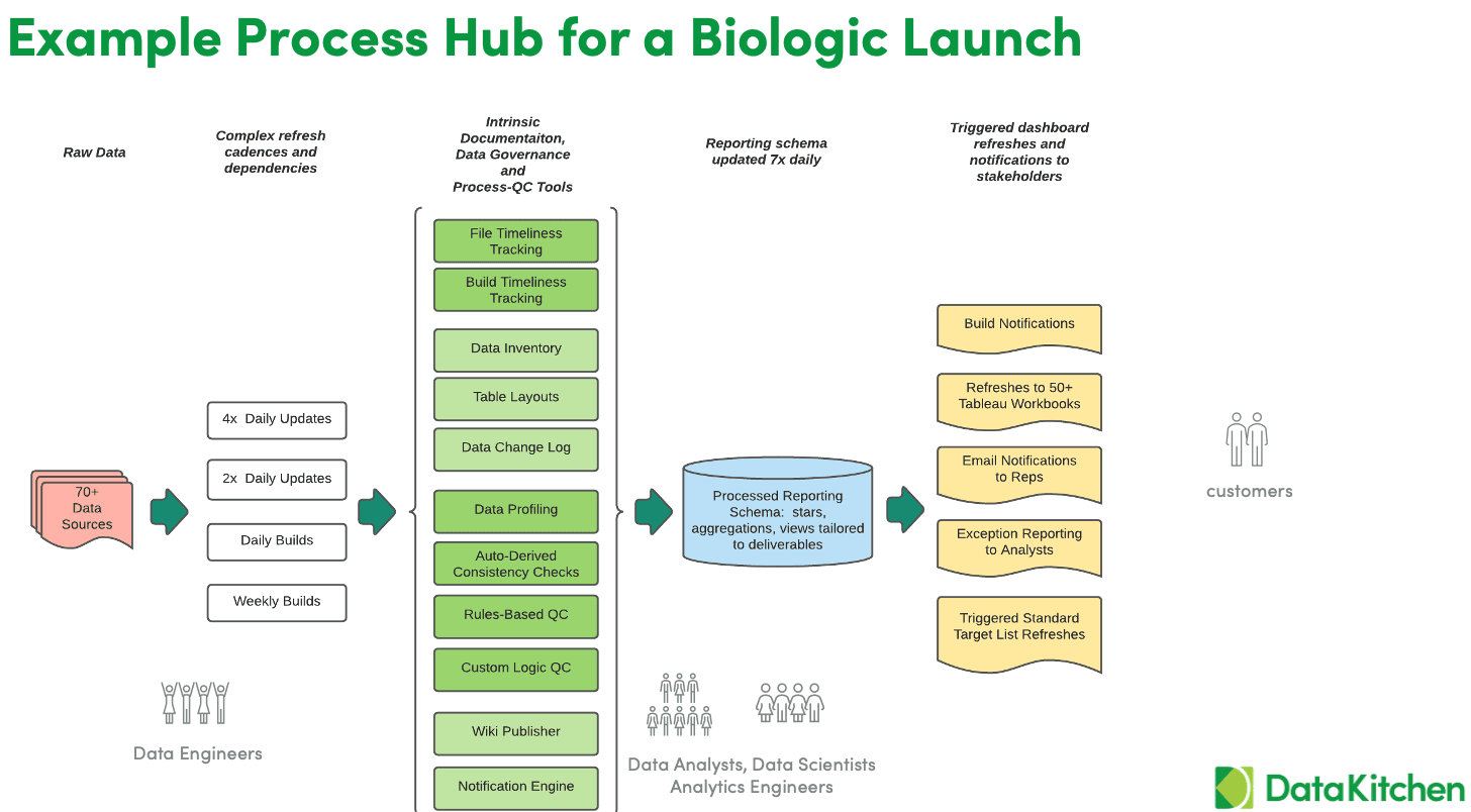 Let’s take a look at an example DataOps process hub for an actual biologic launch. The data pipelines must contend with a high level of complexity – over seventy data sources and various cadences, including daily/weekly updates and builds. Biologic data is complicated and not clean, so the process hub first profiles the data and imposes automated, rule-based quality checks. Has the data arrived on time? Is the quantity of data correct? When the tests pass, the orchestration admits the data to a data catalog.