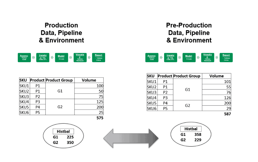 It’s not enough for analytics to be correct. Accurate analytics that “look wrong” to users raise credibility questions. Figure 8 shows how a change in SKU allocations, moving from pre-production to production, affects the sales volumes for product groups G1 and G2. You can bet that the VP of sales will notice this change immediately and report back that the analytics look wrong. Missing expectations is a common issue for analytics – the report is correct, but it reflects poorly on the data team because it seems wrong to users. What has changed? When confronted, the data-analytics team has no ready explanation. Guess who is in the hot seat.