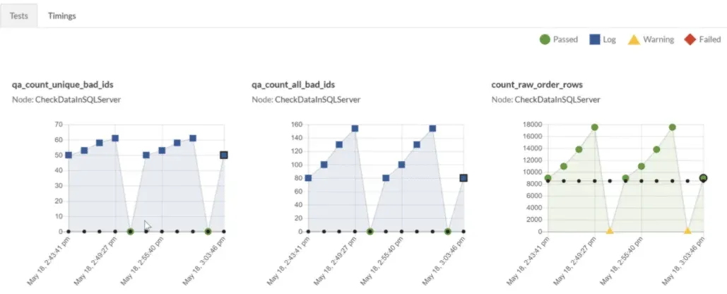 - Time Durations – Testing should not be limited to data. If your pipeline execution takes too long and you miss an SLA, that’s an error. Execution times are tracked so you can check to see if your process goes too long
