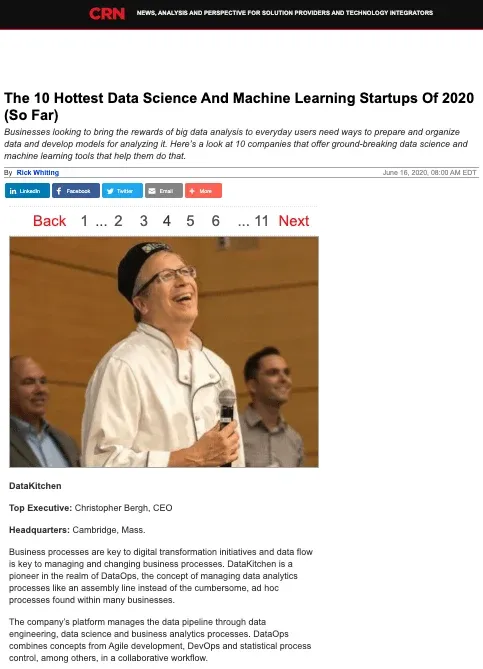 In June of 2020, CRN featured DataKitchen’s DataOps Platform for its ability to manage the data pipeline end-to-end combining concepts from Agile development, DevOps, and statistical process control: