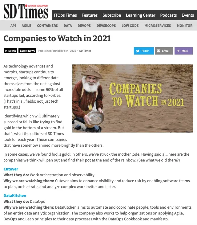 In October of 2020, DataKitchen’s Platform was featured in the SD Times’ Companies to Watch in 2021 for its meta-orchestration capability which gives you a ‘single-pane-of-glass’ to coordinate the data, tools, environments, tests, and people in your “data factory”: