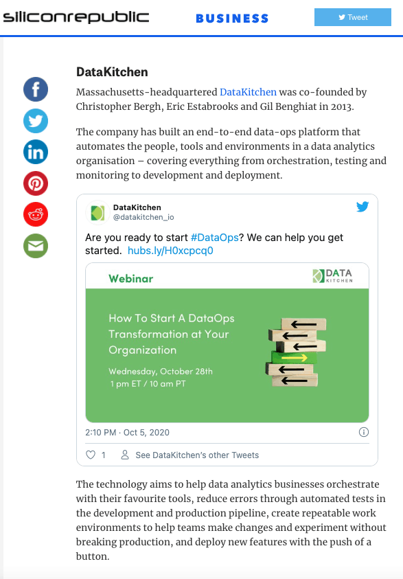 In October of 2020, Silicon Republic featured DataKitchen’s end-to-end DataOps Platform that allows users to orchestrate data teams, existing tools, and self-service sandboxes which leads to reduced errors and faster deployment: