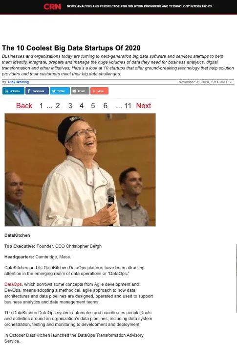 In November of 2020, CRN featured both DataKitchen’s DataOps Platform and Transformation Advisory Services in its article, The 10 Coolest Big Data Startups of 2020: