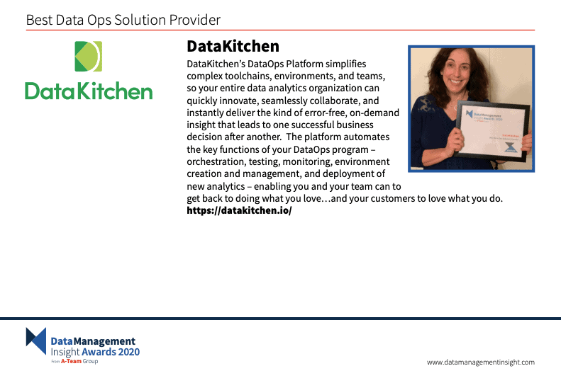 Penultimately, in December of 2020, Data Management Insight named DataKitchen’s DataOps Platform as the Best Data Ops Solution Provider of the year: