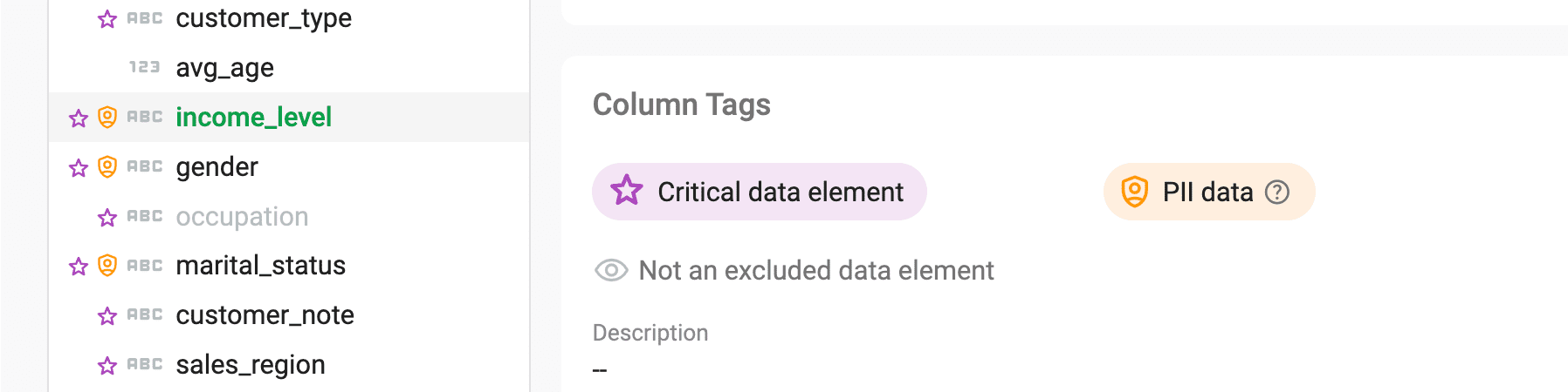 Critical Data Elements (CDEs) are the columns that matter most to the organization: the fields whose accuracy and completeness directly affect business decisions, regulatory compliance, or downstream analytics. Flagging a column as a CDE signals its importance and focuses quality attention accordingly. Data stewards can identify CDEs and document why those columns are critical, creating a shared understanding of data priorities that is visible across the team.