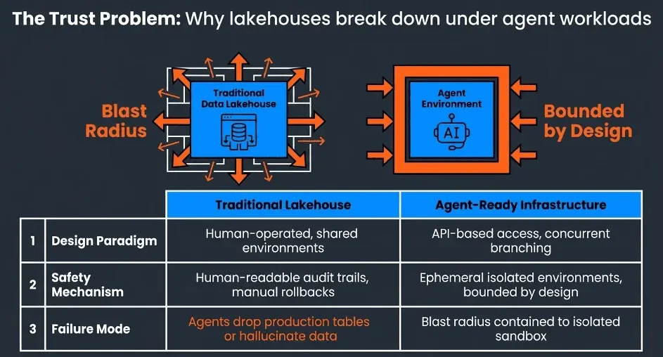 This trust gap is the real blocker for agentic data engineering adoption. It is not a capability problem. Claude Code can do the work. It is an infrastructure problem. Traditional lakehouses were built for human-operated workflows with human-readable audit trails and human-managed rollback procedures. AI Agents like Claude Code need something different.
