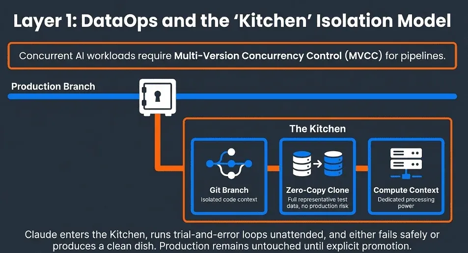 The same principle applies to AI agent environments. Each Claude session needs its own isolated view of the data and codebase, where it can read, write, experiment, and fail without any of that activity being visible to other sessions or to production. At DataKitchen, we call these isolated environments Kitchens. Each Kitchen bundles together three things Claude needs to work autonomously: a Git branch of the pipeline code, a pointer to the correct test data, and a separate compute environment. The test data itself is typically provisioned as a zero-copy clone of production, so Claude has a full representative dataset to run against without touching real data. Claude enters the Kitchen, writes or modifies a transform, runs it against the cloned dataset, evaluates whether the tests pass, and tries again if they do not. That loop repeats, unattended, until the work is done or Claude surfaces a genuine decision it cannot make alone. Production never sees any of it until the work is explicitly promoted.