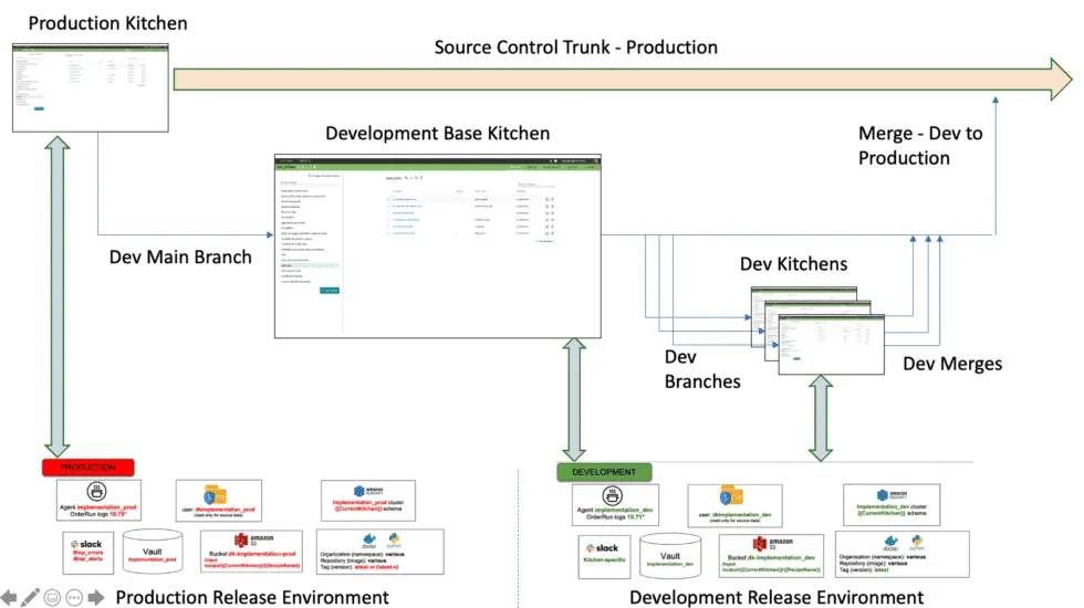 Kitchen C’s branch is promoted. The engineer reviews the diff, a clean, readable transformation built on a full rebuild from immutable raw sources following FITT conventions, and merges it into main in ten minutes. Kitchen A and Kitchen B are discarded. Their branches are deleted, their compute contexts shut down, and their zero-copy clones released. Nothing from those sessions ever made it into production.