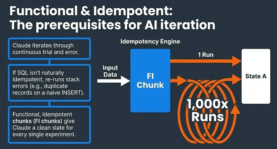 For Claude, idempotency is not a nice-to-have. It is the property that makes autonomous iteration possible at all. Claude’s approach to any task is trial and error: write a solution, run it, evaluate the result, adjust, and try again. That loop only works if every run starts from a known state and produces a deterministic result. Without idempotency, Claude’s re-runs stack errors on top of each other. With it, each iteration is a clean experiment.