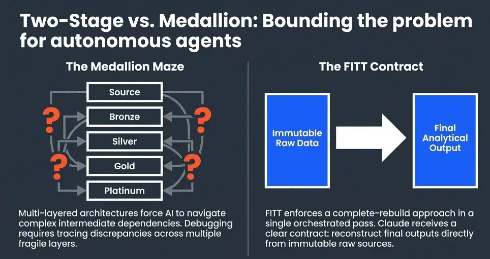 The second layer is architectural. We call it FITT: Functional, Idempotent, Tested, Two-stage. Most data architectures are designed around vendor capabilities or medallion-layer conventions. FITT is designed around data engineer productivity and, as it turns out, AI agent productivity too. The principles that make pipelines easier for humans to reason about and recover from are precisely the principles that make them safe and productive for an autonomous agent to work on.
