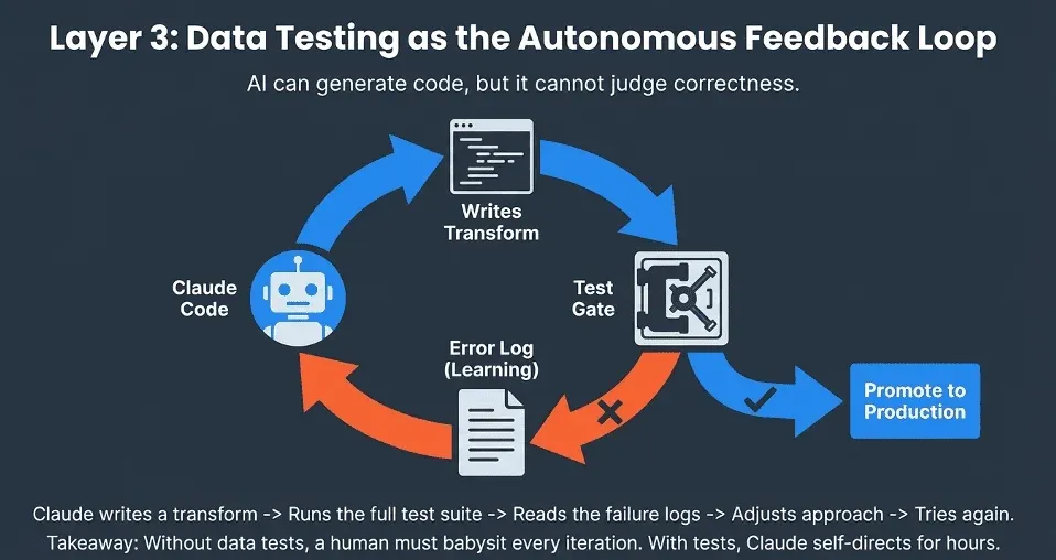 High coverage data tests are the mechanism that turns Claude Code from a code generator into an autonomous engineering agent. Without them, you need a human in the loop for every iteration. With them, Claude can self-direct.
