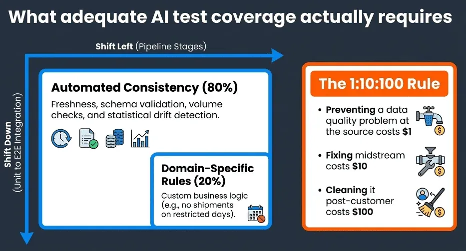 The Definitive Guide frames test coverage around two complementary strategies: shift left and shift down. Shifting left means running data quality tests earlier in the pipeline lifecycle, catching problems before they propagate downstream and become exponentially more expensive to fix. The 1:10:100 rule captures the stakes: preventing a data quality problem at the source costs roughly $1 per record; fixing it midstream costs $10; cleaning it up after it has reached customers costs $100. Shifting down means going beyond unit-level validation to integration and end-to-end testing that validates how components interact across the full pipeline, not just in isolation.