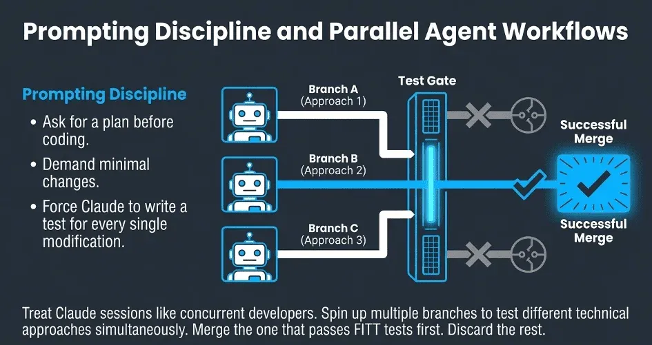 Prompting discipline makes a measurable difference. Before Claude starts any task, ask it to make a plan and review it with you before touching anything. Ask what assumptions it is making. This two-minute check prevents Claude from spending 40 minutes on an approach that misses a constraint you forgot to mention. During work, push Claude toward minimal changes: the prompt that consistently produces tighter, more reviewable diffs is simply asking for the minimum change needed to achieve the goal. After Claude makes changes, ask it to write a test that proves the changes are correct. This directly feeds the test coverage that makes autonomous iteration possible and keeps the feedback loop tight. Explicitly save work to disk before clearing context.