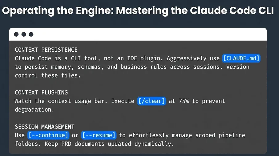 Context management is a skill you will develop quickly. Watch the context usage bar in the CLI, and use /clear when it reaches 75%. Organize your work into one session per folder, grouped by topic or pipeline stage. When you need to resume, the fastest path is claude —continue to pick up the last session instantly, or claude —resume to browse and select from named sessions. For longer-running agent workflows, create a PRD (planning document) in the folder; ask Claude to update it as work progresses. A well-maintained PRD is structured knowledge, not just chat history, and it is what allows a teammate or a fresh Claude session to step in without losing ground.
