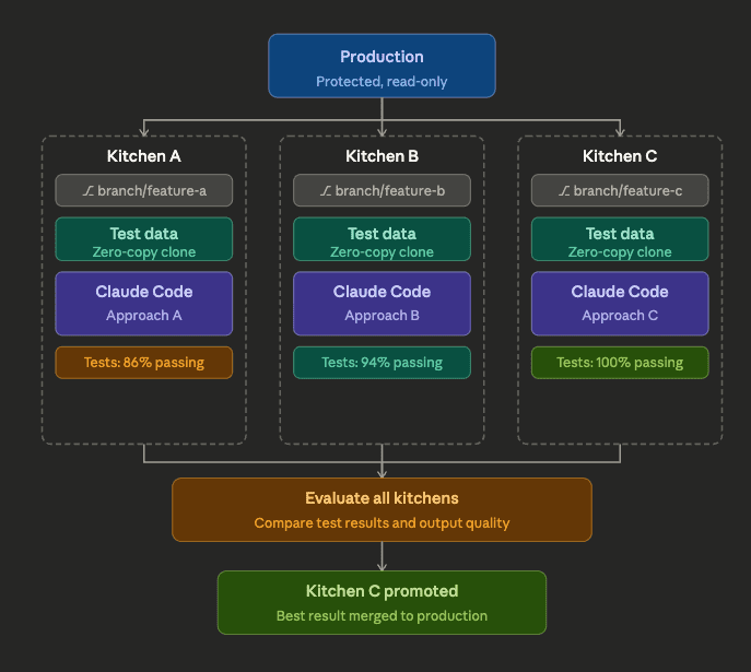 Think of it as an ephemeral Kitchen for AI agents to work in. You can spin up many Kitchens for many agents simultaneously, each one cooking up a different approach to the same problem. Once their test cooking is complete, you evaluate the results, select the best dish, and promote it to production. The others get discarded. No mess, no risk, no cleanup.