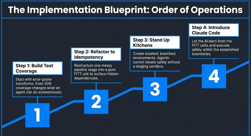 How do I start moving toward this model that enables Claude Code’s success? Build your data test coverage first. Start with the transforms that are most error-prone or most business-critical. Even 50% coverage on key transforms changes what Claude can do autonomously. Then refactor toward idempotency. Pick one messy pipeline stage and restructure it as a FITT unit. The refactor itself will surface hidden dependencies and assumptions that have been buried in the code. Next, stand up isolated branched environments. If your pipeline can only run in one place, you cannot safely let Claude iterate. Then, and only then, introduce Claude Code. With the foundation in place, the onboarding is fast. Claude learns the patterns from your existing FITT units and tests, and productive output starts immediately.