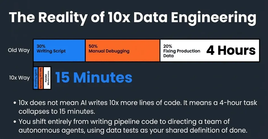 AI coding tools like Claude Code are generating significant excitement in software engineering. But for data engineers, getting 10 times the productivity isn’t automatic. Just adding an AI agent to a messy pipeline and hoping it works usually leads to frustration.