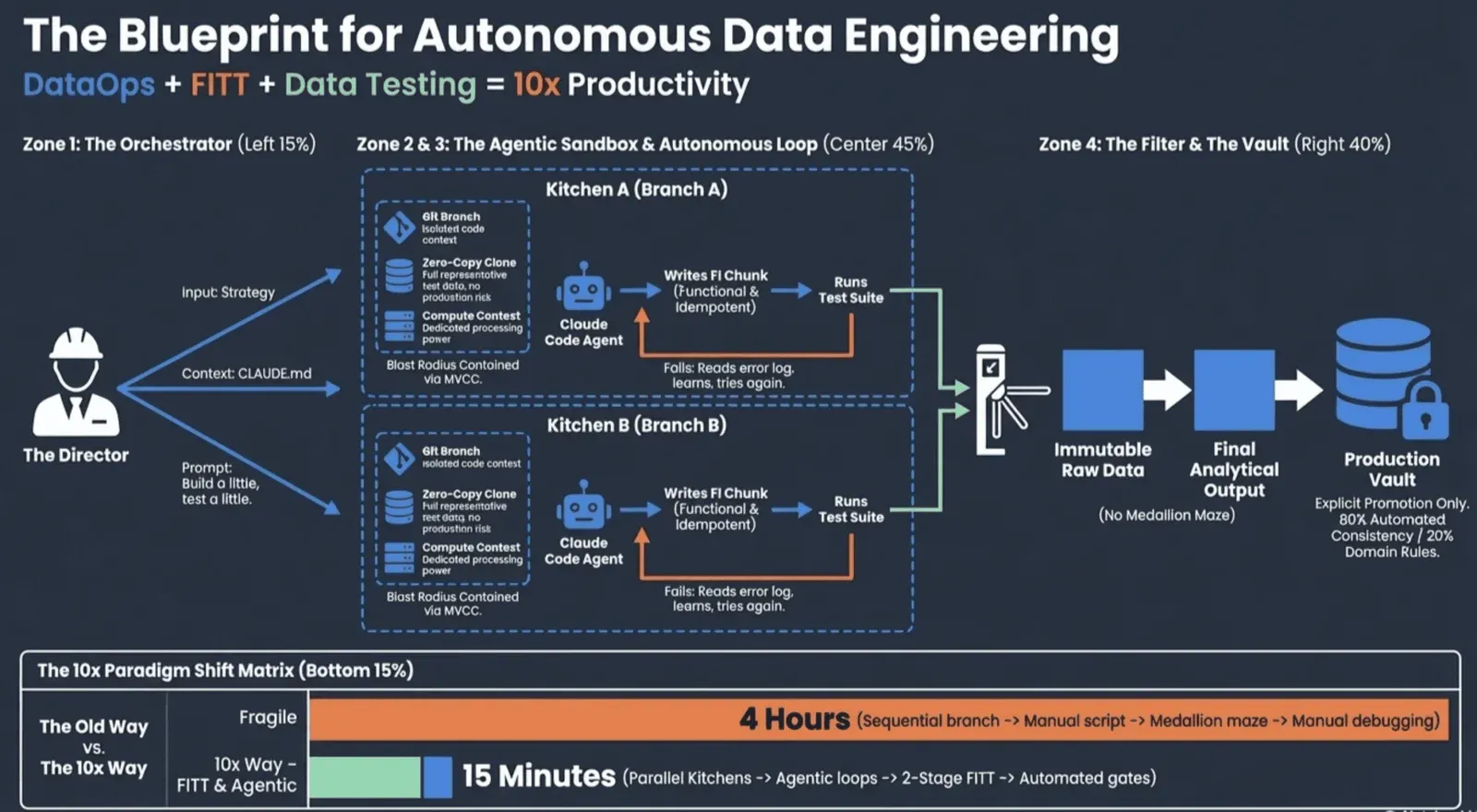 None of this happens without the foundation. DataOps provides the branching and process discipline. FITT provides the granularity and idempotency that make autonomous iteration safe. Data testing provides the feedback loop that enables autonomous iteration.