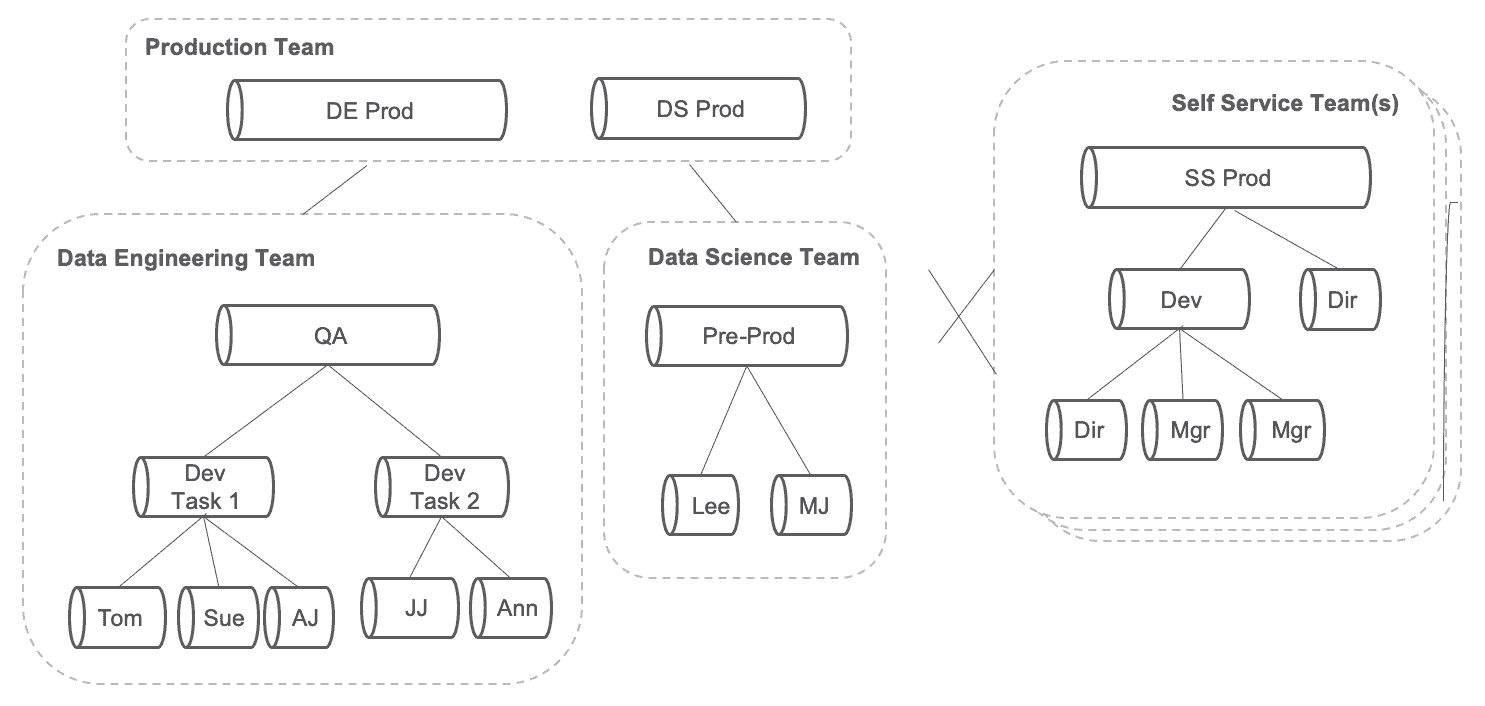 Figure 4: The development of new analytics by various teams and self-service users is a DAG of DAGs that flow into production.