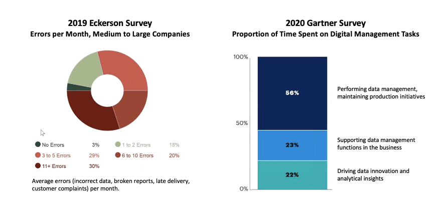 Jason’s experience is not a unique one. A 2019 DataKitchen/Eckerson survey found that 79% of companies have more than three data-related errors in their pipelines per month. A 2020 Gartner survey revealed that 56% of engineer time is spent on operational tasks and addressing errors, not on innovations and customer requests.