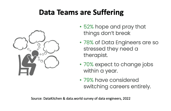Another result is rampant frustration within data teams. A survey of data engineers conducted by DataKitchen in 2022 revealed some shocking statistics. Data engineers are the people building pipelines, as well as doing data processing and data production. And they are suffering: 78% feel they need to see a therapist, and a similar number have considered quitting or switching careers. The industry is experiencing a shortage of people who do data work due to a supply problem as well as the exodus of people leaving the field because it’s so stressful.