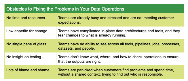 Many companies are stuck in a culture of “hope and pray” that their changes and integrations won’t break anything and a practice of “firefighting” when things inevitably go wrong. They wait for customers to find problems. They blindly trust their providers to deliver good, consistent data on time. They interrupt the daily work of their best minds to chase and fix a single error in a specific pipeline, all the while not knowing if any of the other thousands of pipelines are failing.