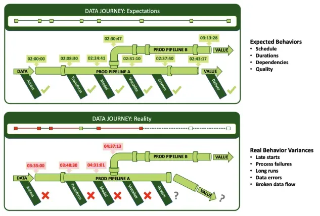 In addition to the tracking of relationships and quality metrics, DataOps Observability journeys allow users to establish baselines⸺concrete expectations for run schedules, run durations, data quality, and upstream and downstream dependencies. Observability users are then able to see and measure the variance between expectations and reality during and after each run. This aspect of data journeys gives users real-time information about what is happening now or later today, and if data delivery will be on time or late. It can feed a report or dashboard that lists all datasets and when they arrived, as well as the workflows and builds that are running.