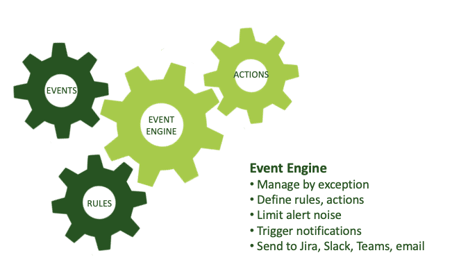 So DataOps Observability captures all this information and stores it in a database, but that is a lot of data that someone has to monitor and sift through. Fortunately, Observability includes an event engine that can react to what’s happening in the journeys and cut down the signal-to-noise ratio. Given a set of rules, the event engine can trigger notifications through email or to Slack and other services, send alerts to your operations people, issue commands to start or end pipeline runs, and prompt other actions when the difference between expected results and actual runs exceeds your thresholds of tolerance.