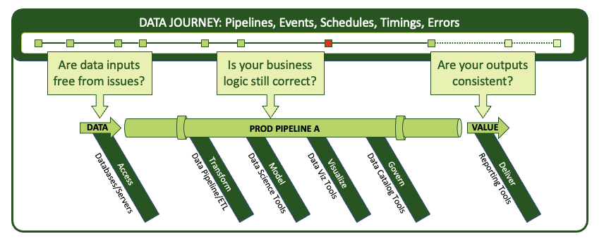 You want to track more than the schedule and duration of your runs. You want to check that the contents of your pipelines⸺the data, the models, the integrations, the reports, and the outputs that your customers see⸺are as accurate, complete, and up to date as expected. You want to find errors early. To do that, your journeys need to include automated tests.