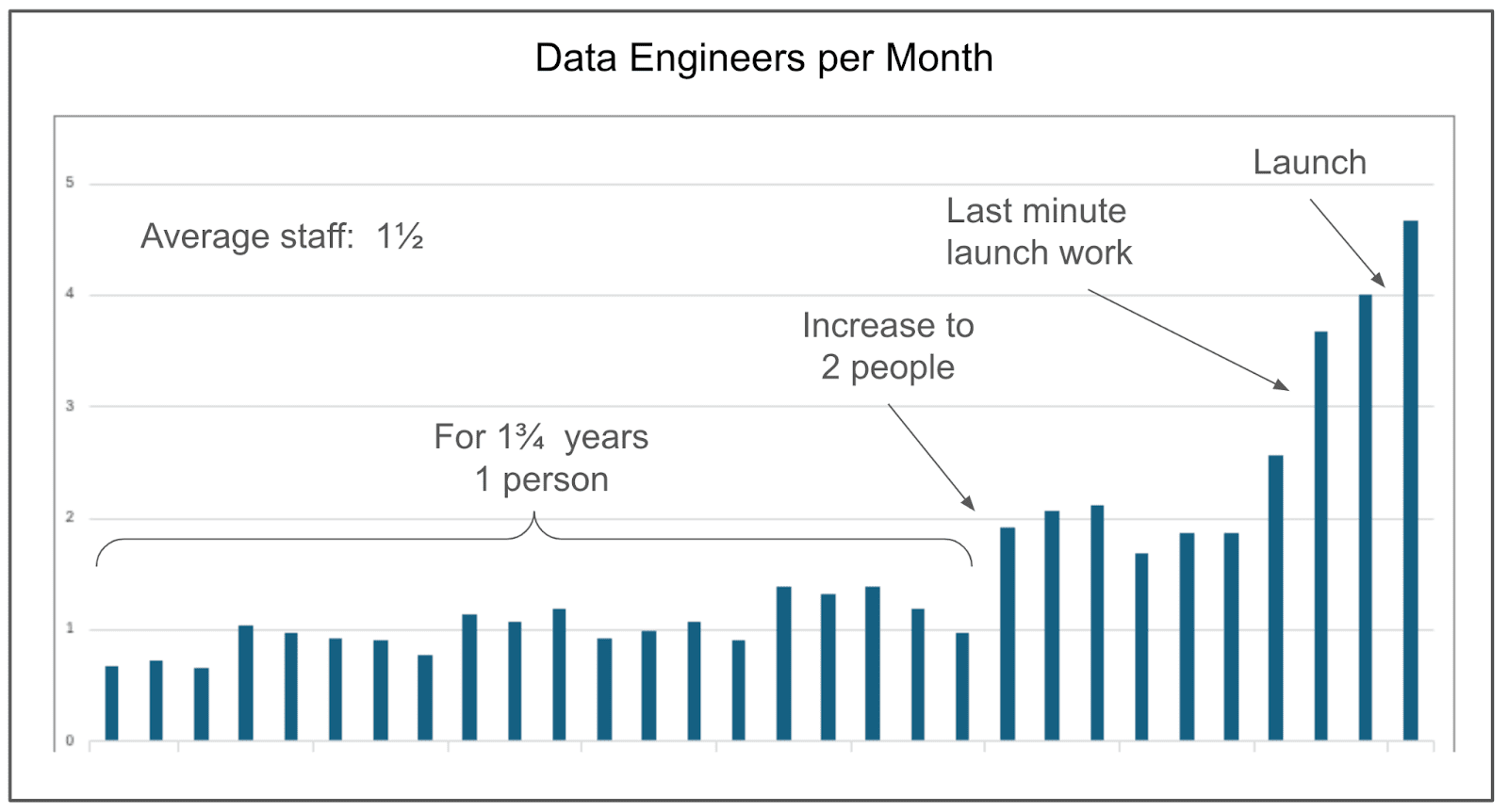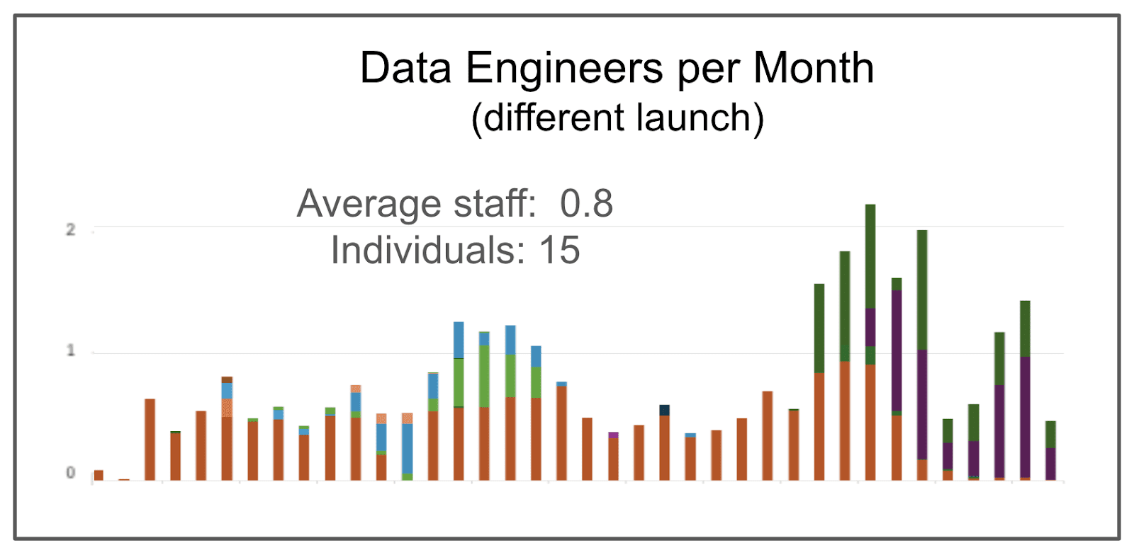 In a different launch, the company using DataKitchen’s Automation software were able to have 15 individuals contribute to the pre-launch analytics (over 36 months) with an average of 0.8 FTE. Here is a graph of that staffing (each color is a different individual).