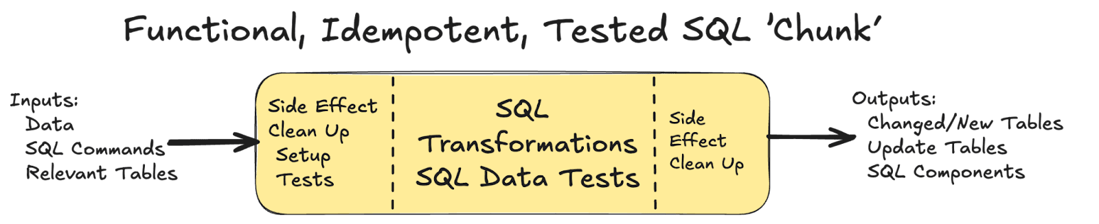 The solution lies in structuring SQL transformations as discrete, self-contained units that explicitly manage their state and dependencies. These Functional and Idempotent chunks—FI chunks—become the fundamental building blocks of FITT-compliant data pipelines implemented in SQL. Making SQL fully functional is an active area of research in databases. Our approach uses the varieties of SQL that come with the top analytics databases today: Redshift, Snowflake, BigQuery, Synapse, etc.