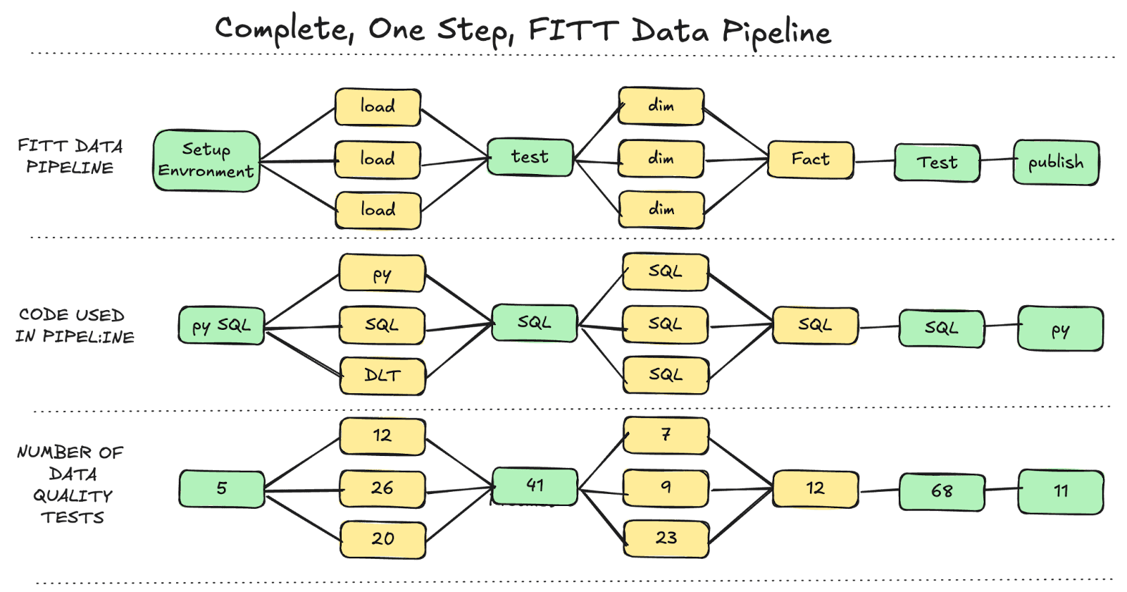 Make sure your FI chunks are small, independently testable components that can be developed and validated in isolation. In the diagram below, we have FI chunks that load a data set, build a dimension table, and the fact table.