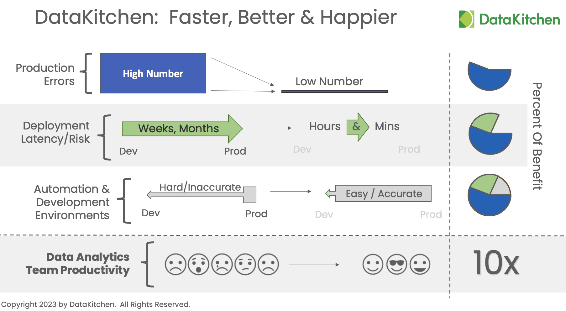 We see the 10x productivity improvement coming from some key enablers. The first is the reduction of errors in production with automated end-to-end observability. The second is decreasing the cycle time and risk of deploying to production with automated testing. The third is automation and enabling governed secure, self-serve development environments. When these enablers are implemented, such as through DataKitchen products, teams will work faster, produce higher-quality results, and will be happier.