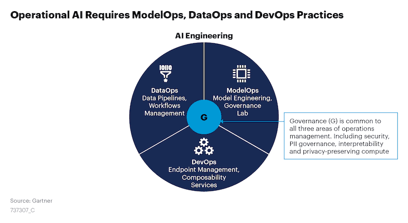 In this report, Gartner outlines recommendations to effectively operationalize AI solutions that involve the core management competencies of ModelOps, DataOps, and DevOps. Although there is a good degree of overlap between these practices, Figure 1 illustrates their interrelationship.