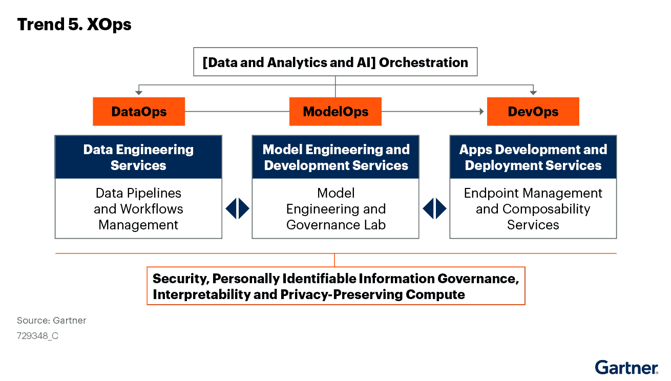 Gartner: “ XOps practices link development, deployment and maintenance together to create a shared understanding of requirements, transfer of skills and processes for monitoring and maintaining analytics and AI artifacts (see Figure 2).”