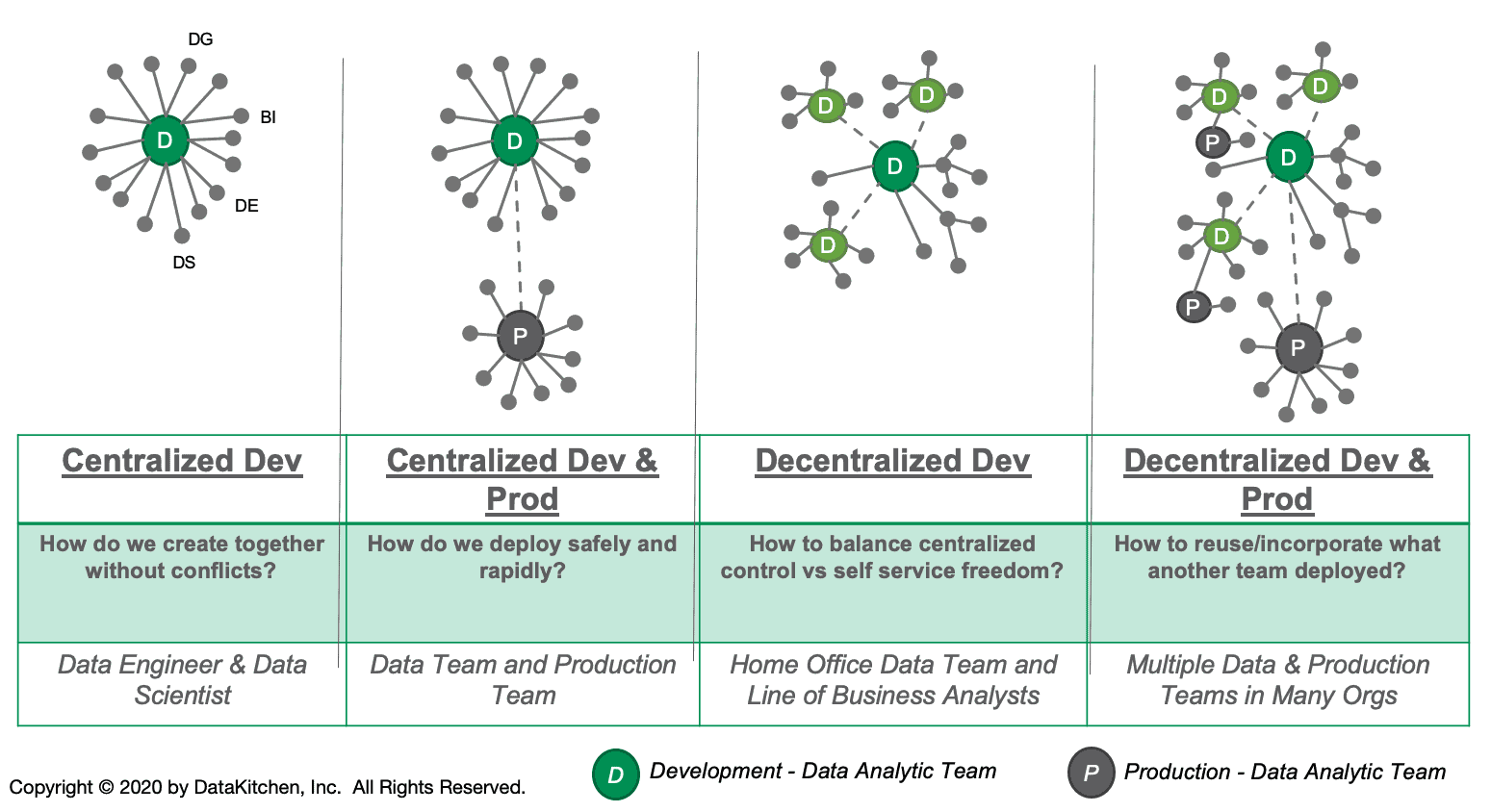 Figure 1: Most analytics organizations have a mix of self-service and centralized tools that combine to deliver insight to their end customers. Decentralized development creates a many-to-many relationship between development and production, but that activity must be governed.