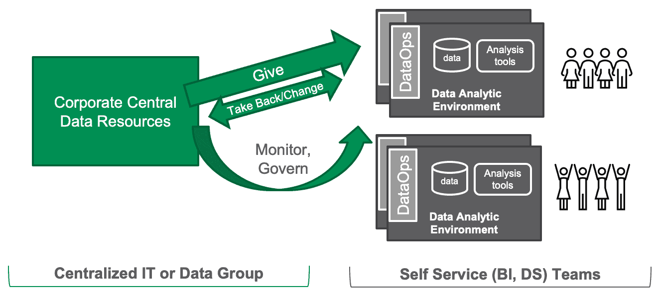 Centralization enables data organizations to control access to sensitive information, standardize metrics, clean/wrangle data, deliver data and analytics on an enterprise level, and control operations. However, centralized development teams can’t keep up with the never-ending flow of requests and ideas from business users.